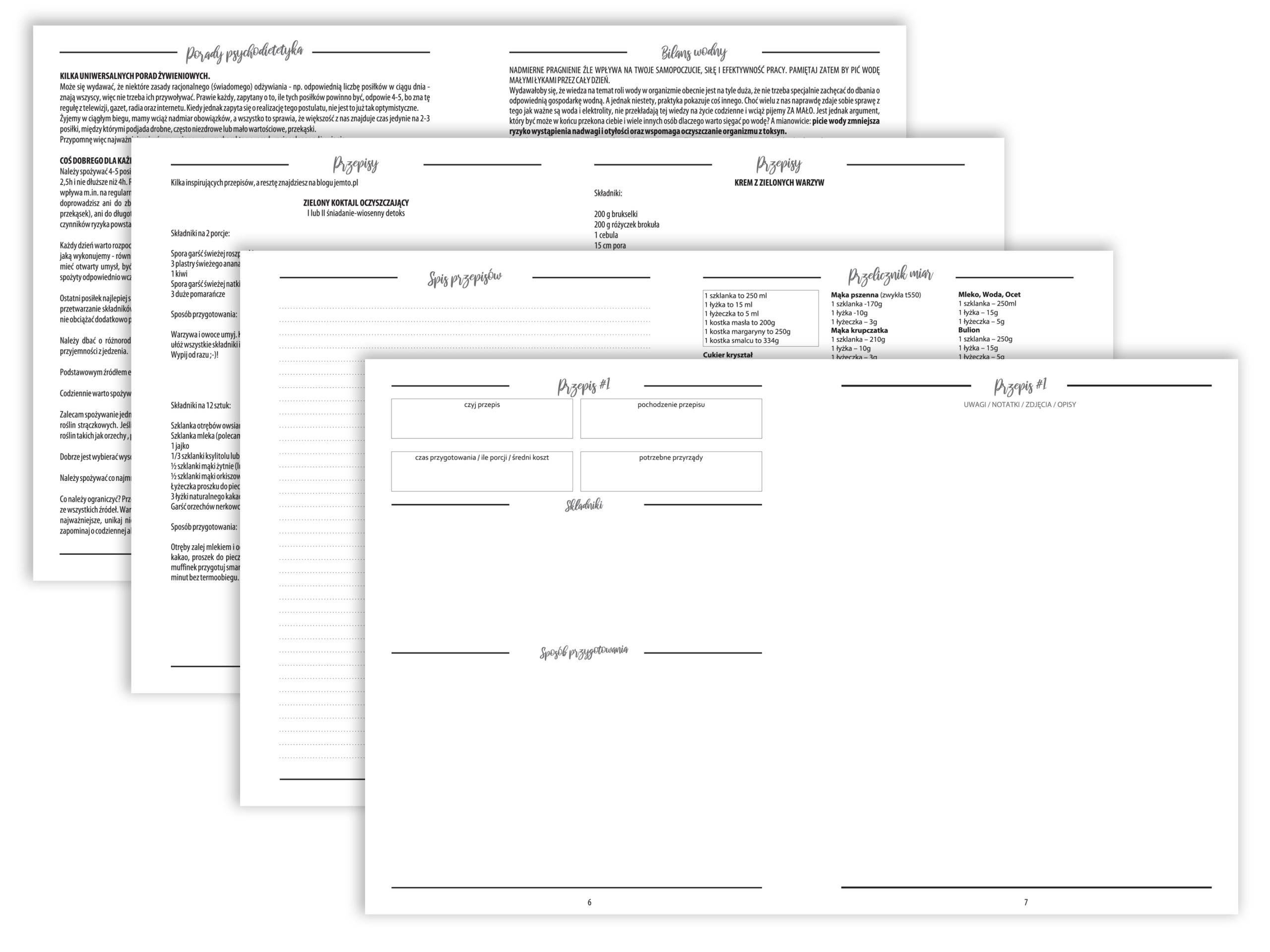 Znajdziesz w nim miejsce na zapisanie genezy przepisu, kosztów potrawy czy potrzebnych przyrządów kuchennych. Na kilku pierwszych stronach znajdziesz miejsce na spis treści. Dzięki ponumerowanym stronom łatwo oznaczysz i znajdziesz każdy przepis.