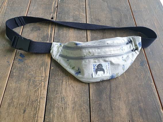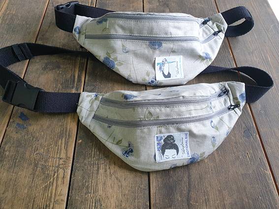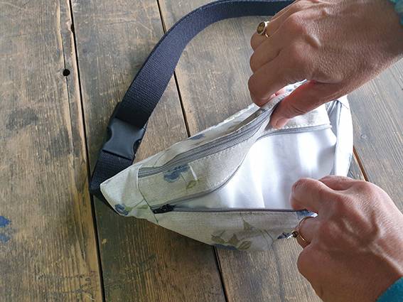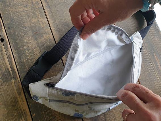 2 osobne kieszonki zamykane na zamki, pasek czarny z bawełnianej taśmy o szerokości 3 cm;