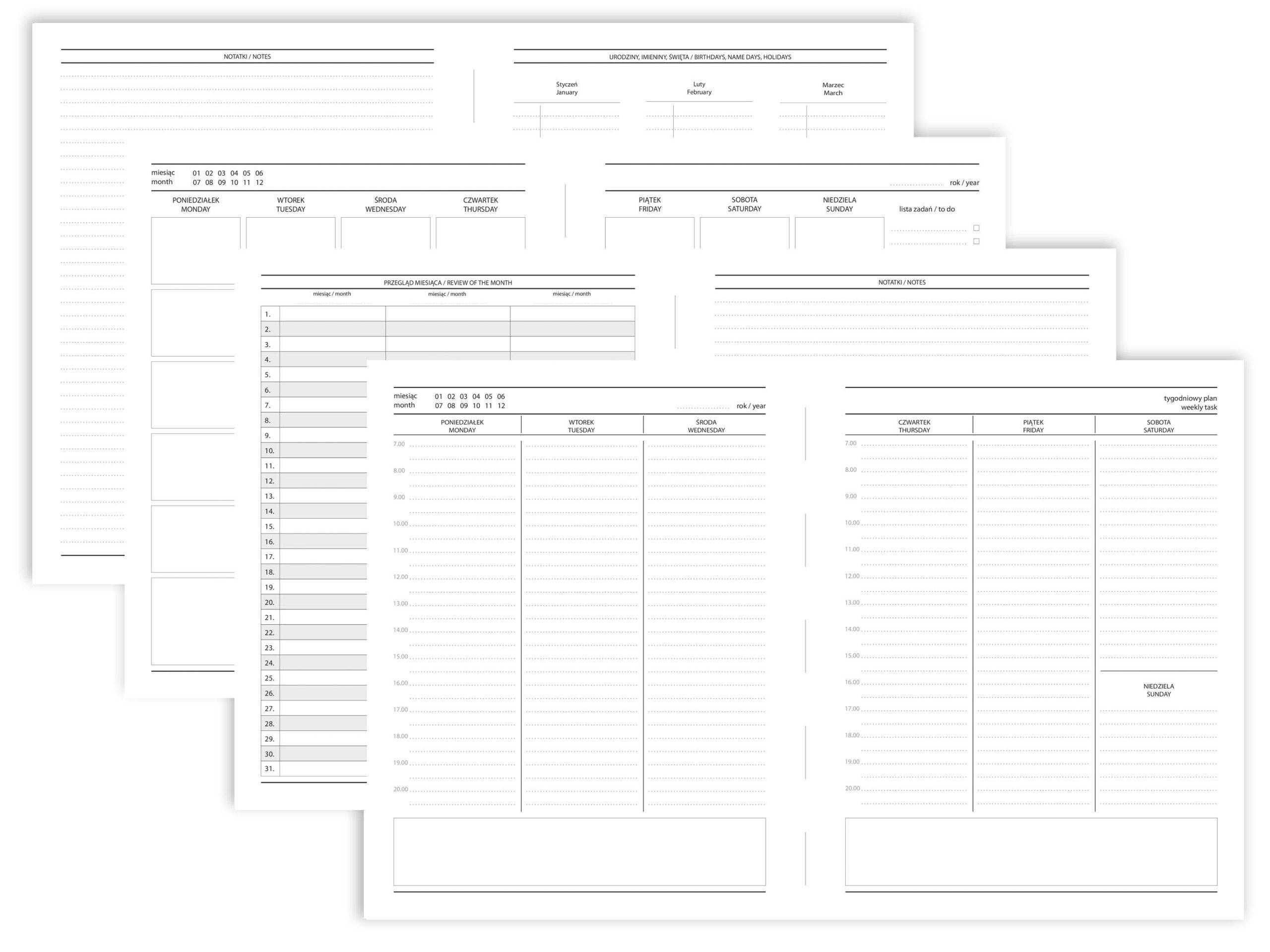 - Brak dat umożliwia dostosowanie układu stron do Twojego stylu pracy – możesz wprowadzać własne oznaczenia dni, tygodni czy miesięcy.